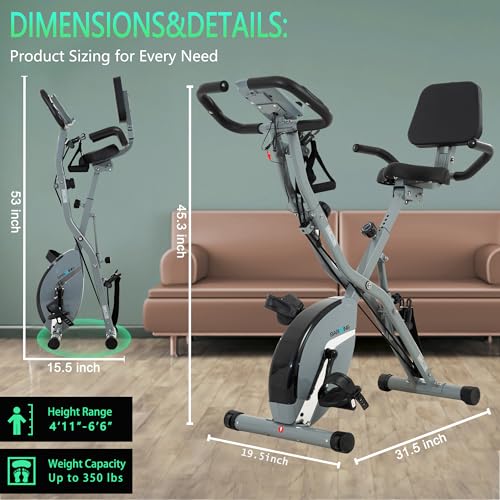 【FOLDABLE EXERCISE BIKE】 16-8-2-3: 16 Levels adjustable magnetic resistance. 8 Seat height adjustments. 2 Seat angle adjustments. 3 Workout bike posture adjustments: upright, recline, and folding. Exercise equipment for home allows you to exercise more freely and comfortably, and burn your calories as much as you like.